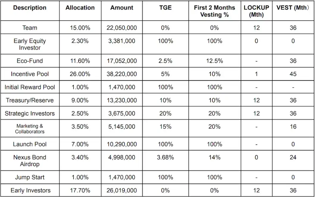 白皮书中代币的分配比例如下,团队和投资者会分配约总量 40% 的代币量;通过计算 TGE 可得当前流通量为 21,969,520 枚,10,290,00 枚由 Binance Launch Pool 分发,早期股权投资者持有 3,381,000 枚代币,占当前流通量的 15.38%。