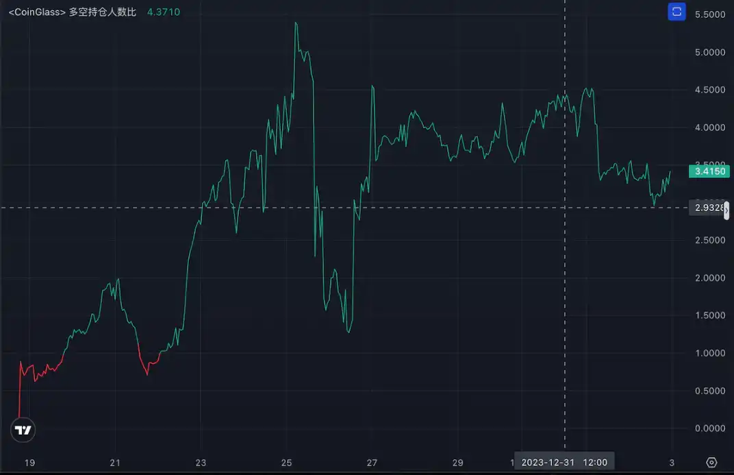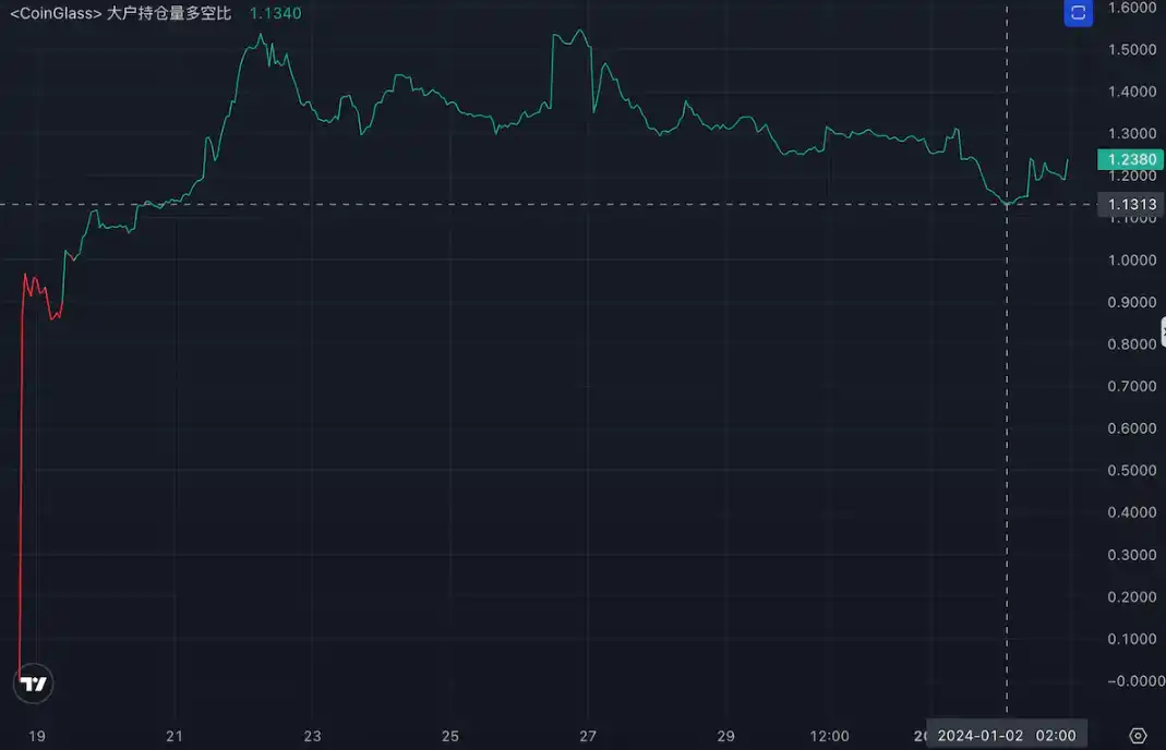 ACE 的合约多空人数比比自 2023 年 12.27 日以后始终保持在 2.9 以上,近 24 小时在 3 以上;大账户多空比近 7 日保持大于 1.13