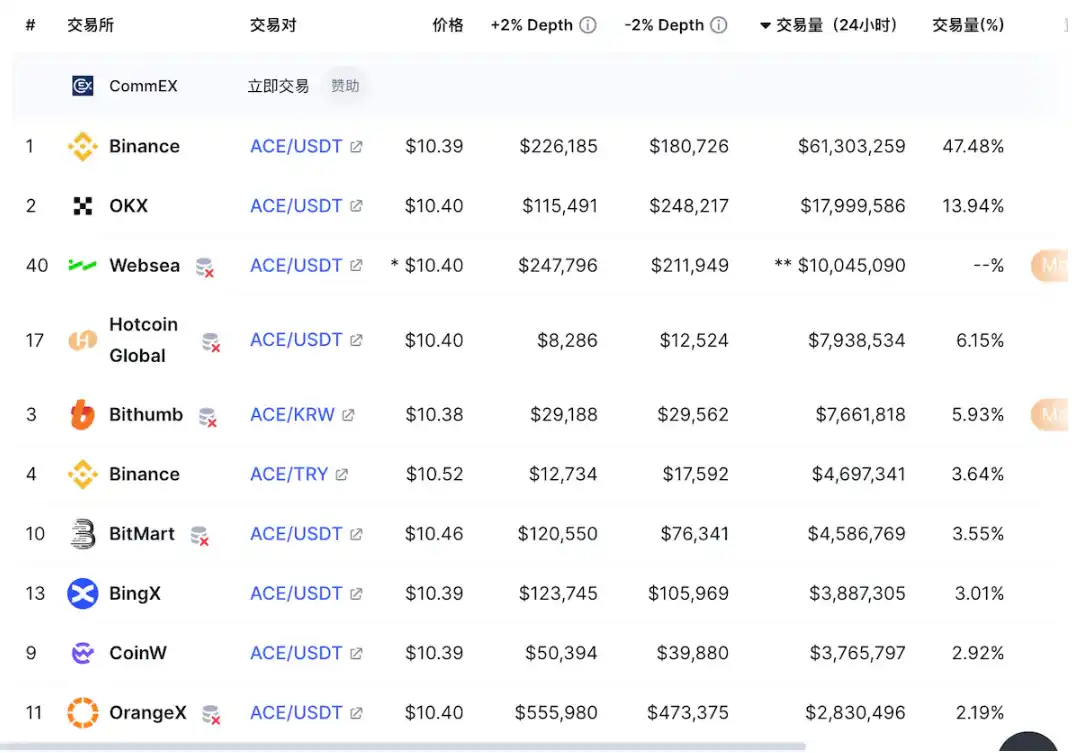 ACE 的主要交易场所为 Binance(47.48%),其次是 OKX(13.94%)与 Bithumb(5.93%)