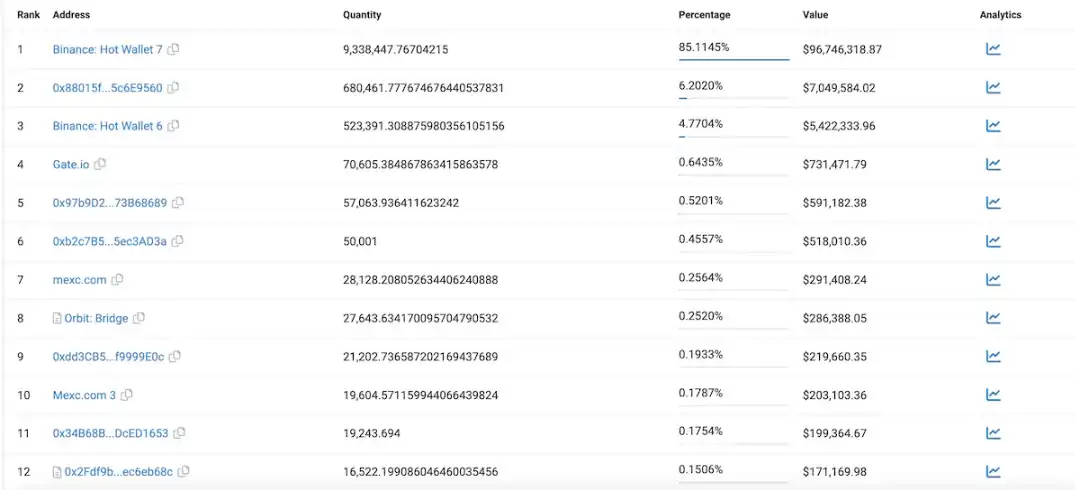 ACE 代币主要分布在 BSC 链与 Endurance 主网上,BscScan 当前可追踪代币数 10,971,626 枚,其中 Binance 地址占比约 90%,持币第二大地址 0x880 持有约 6.2% 的代币。