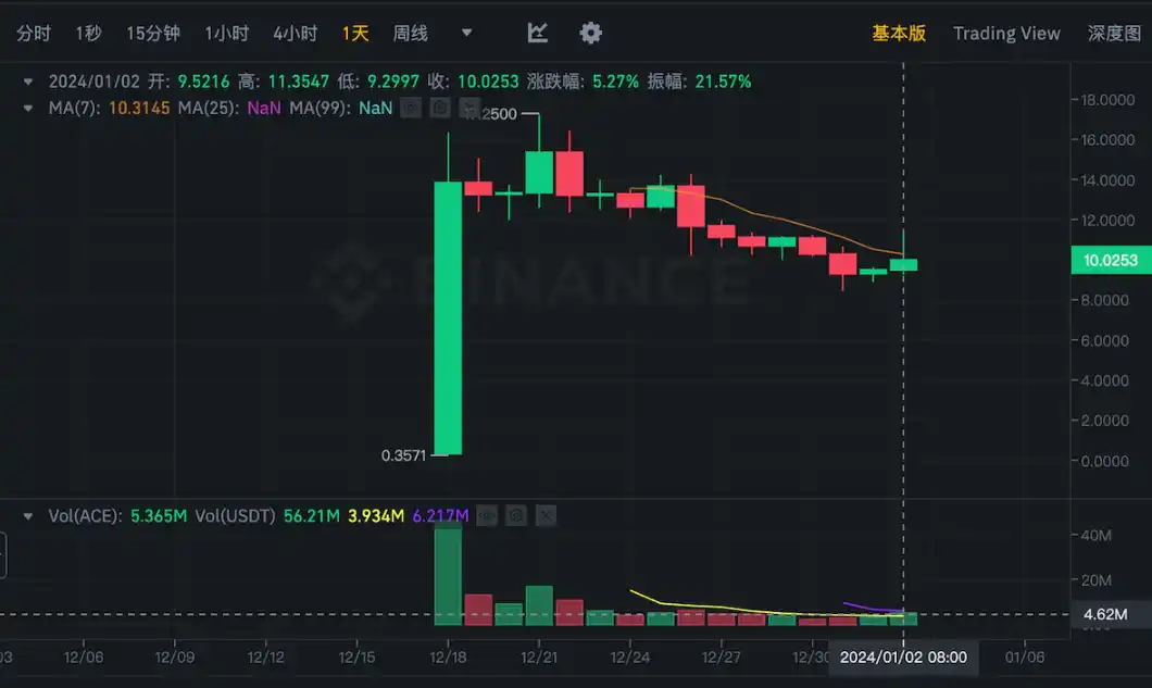 近 24 小时 Binance 现货交易量相较前日有所增长,为 536w 枚代币,自 12.22 日价格下跌 13% 至 13 美金后日交易量逐步减少,7 日交易量约为 200w-500w 枚 ACE/日。