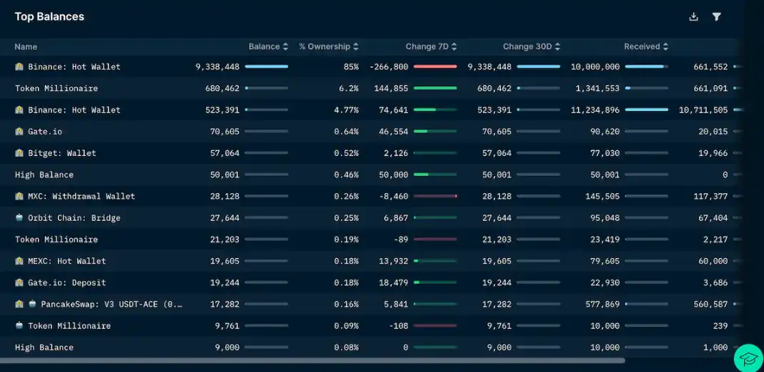 2、ACE 的筹码结构偏集中,总供应量中大量代币掌握在项目和投资人,当前流通量中早期股权投资人持有了流通量的 15.38%,BSC 可追踪地址中,Binance 地址占比约 90%,构成了潜在抛压的主要来源。