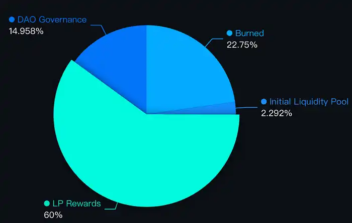 代币总量为 21 亿枚,其中 10% 用于 IDO,60% 用于挖矿,10% 归属于团队,10% 用于空投,流动性池和金库各 5%。