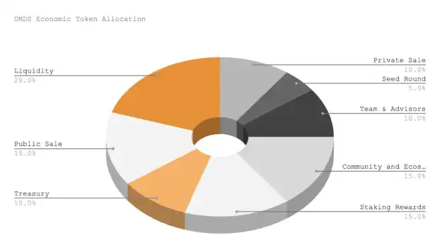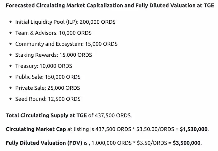 平台代币 ORDS,总供应量 1,000,000,私募轮价格 3.50 美元,种子轮价格 2.00 美元。TGE 流通量 437500ORDS,按照当前 16 刀的价格 MC7m,FDV16m。