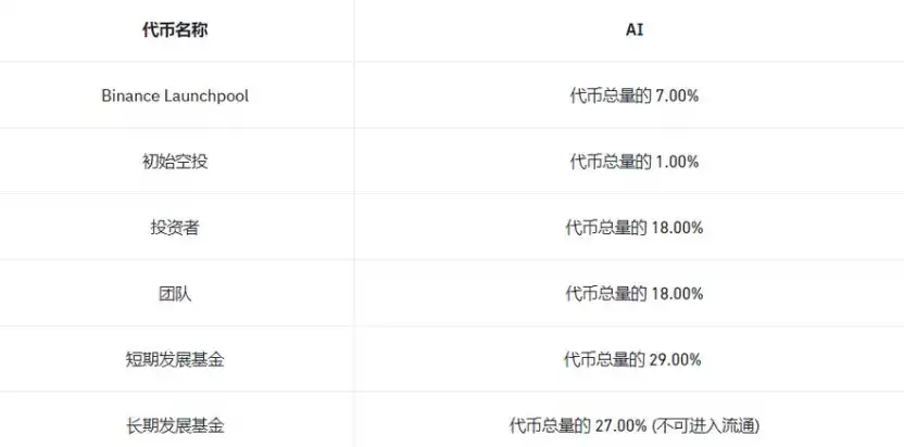 根据白皮书和 Binance 上的公开信息,代币 AI 的总量 10 亿枚,具体的分配为: