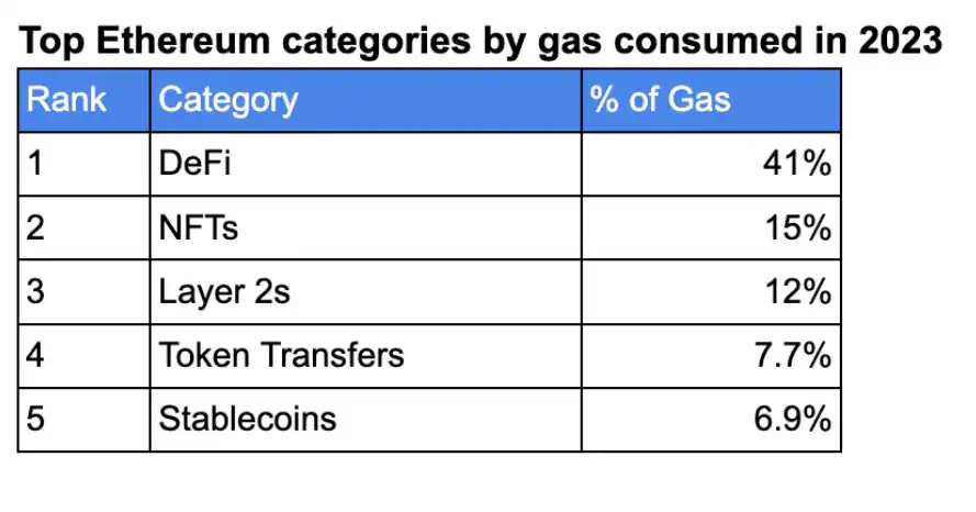 ·USDC 和 Tether 是交易量最高的两个应用,占 Gas 使用量的 7%,突显了以太坊上对稳定币的需求