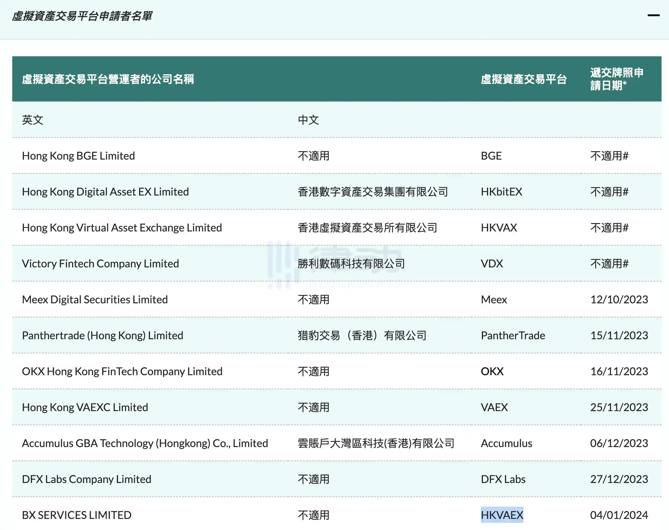1 月 4 日,香港证券及期货事务监察委员会已更新虚拟资产交易平台申请者名单,最新信息显示「BX SERVICES LIMITED」已于 1 月 4 日提交虚拟资产交易平台牌照申请,该公司没有中文名称,旗下虚拟资产交易平台名称为「HKVAEX」。