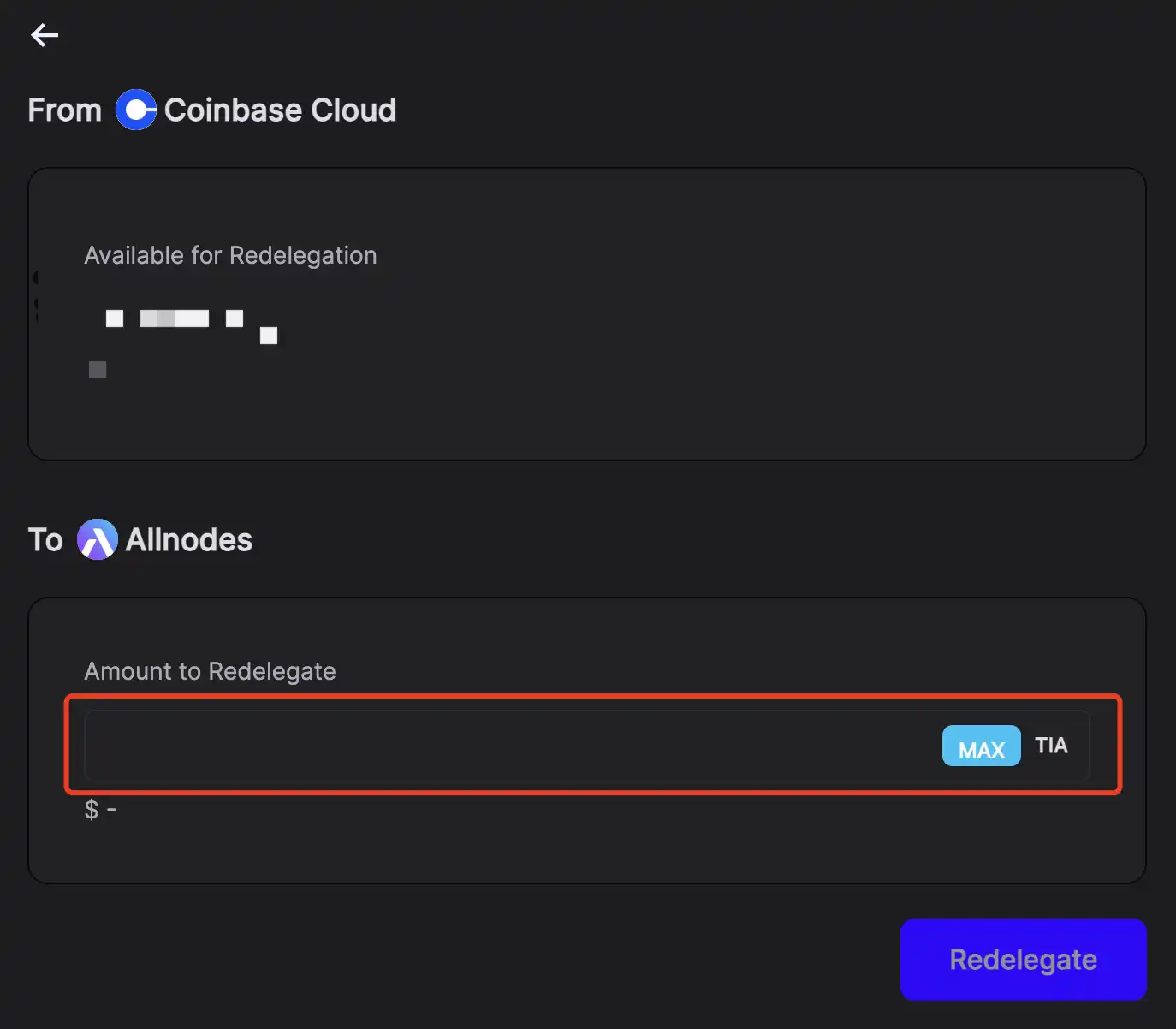 4、选择想要重新质押的 TIA 数量,点击并确认交易即可。