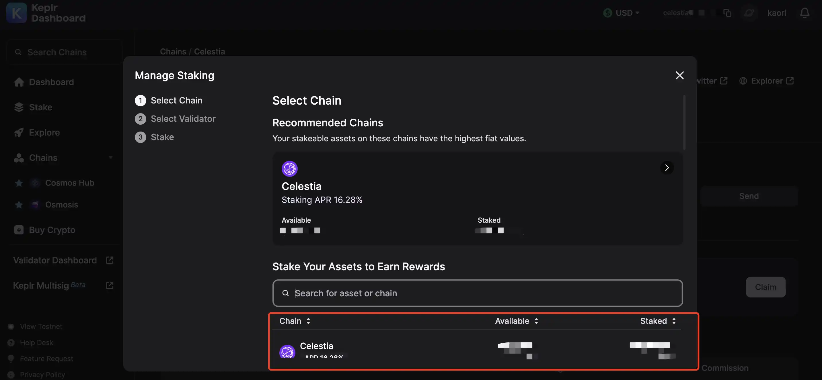 1、在 Leap 插件中点击右上角选择 Celestia 网络,并进入 Stake 界面;