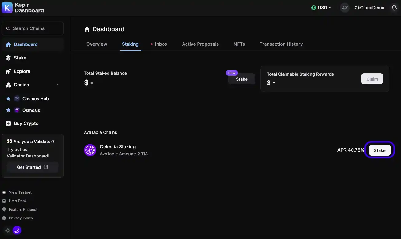 2、如果钱包内有 TIA,就可以看到 Celestia 质押选项,单击「Stake」按钮;