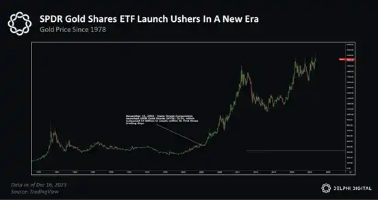 ○ 参考黄金 ETF,2004 年 11 月推出的美国第一只黄金 ETF——SPDR Gold Shares (GLD),在短短三天内就积累了超过 10 亿美元的资产。在成立的第一年,GLD 的管理资产 (AUM) 飙升至超过 30 亿美元。截至 2023 年,全球黄金 ETF 的资产管理规模约为 1,500 亿美元,这表明这些投资工具对黄金市场产生了深远的长期影响。