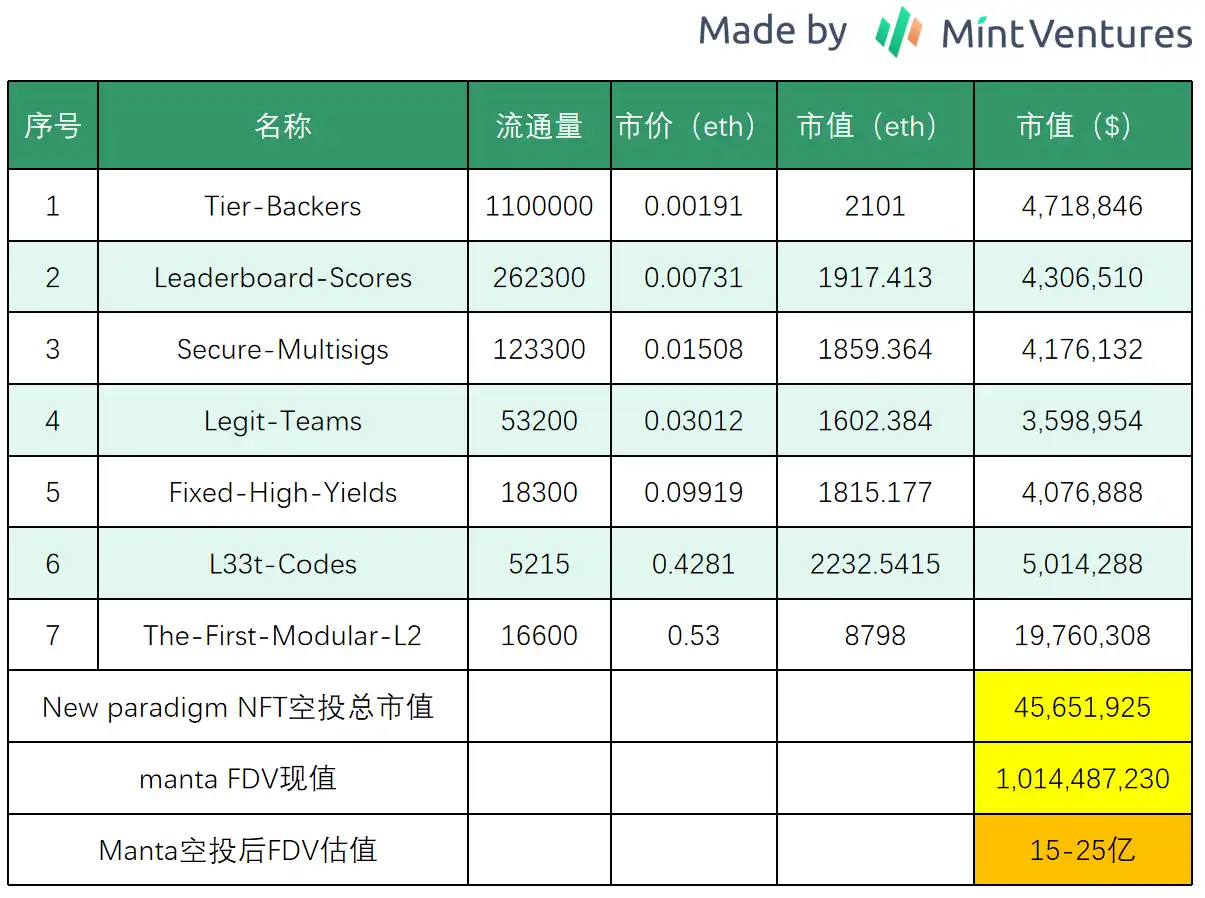 New paradigm 共将分发 4500 万 Manta 代币给 NFT 持有者,占比总量 4.5%,笔者根据今日(24.1.5)NFT 二级市场数据粗略推算,Manta 代币上线后的项目 FDV 估值在 15-25 亿$区间。