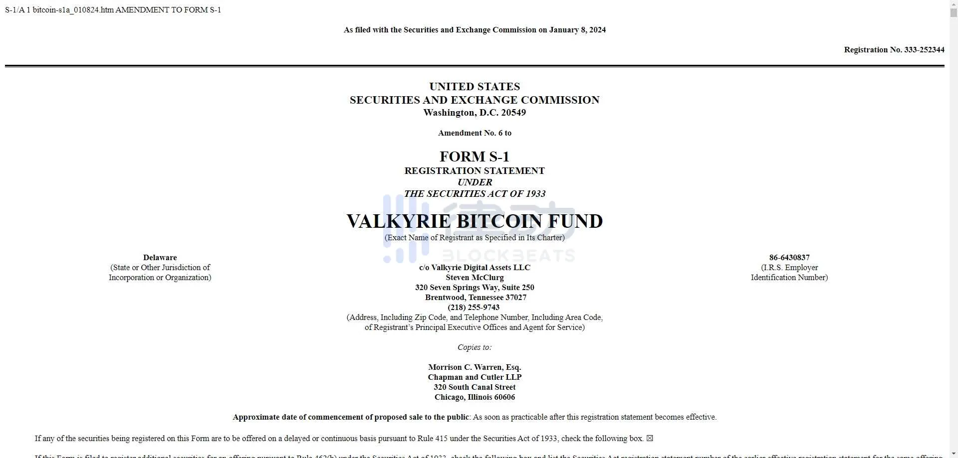 Valkyrie 提交比特币现货 ETF S-1 更新文件