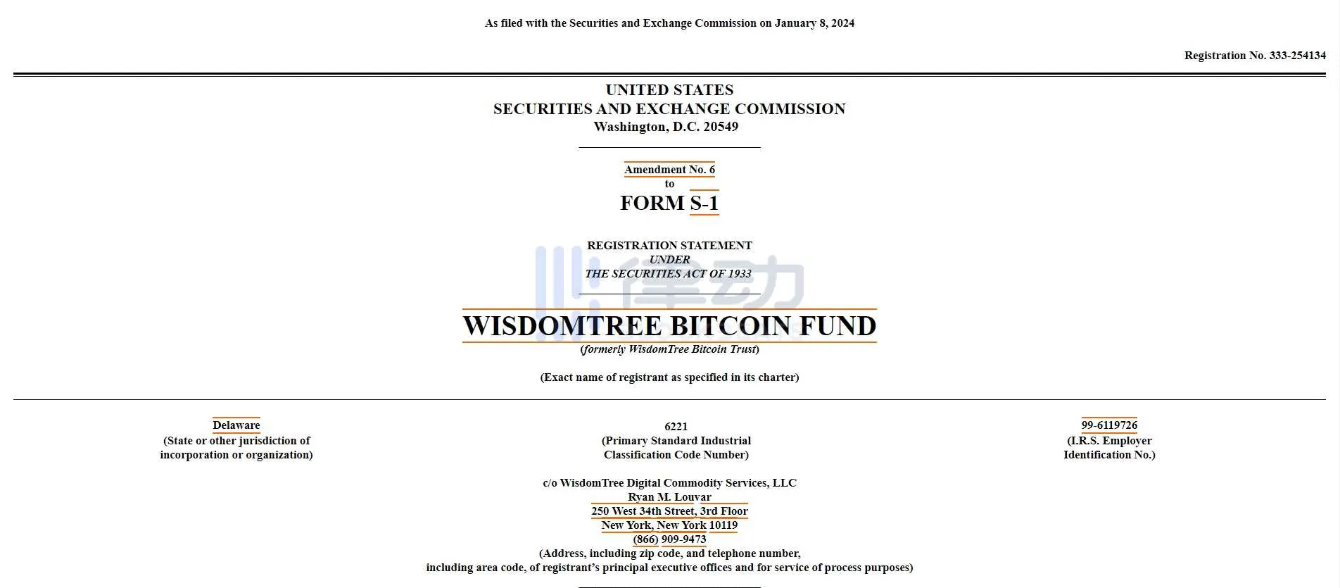 WisdomTree 提交比特币现货 ETF S-1 更新文件