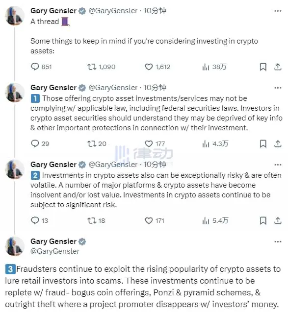 Blockbeats 注:Gary Gensler 此前曾多次在社交媒体上发布加密投资警示信息。
