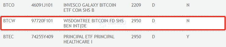 WisdomTree 比特币现货 ETF 代码 BTCW 已在 DTCC 网站列出