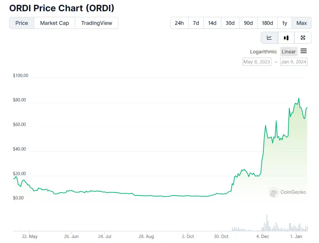 2023 年 3 月 8 日,匿名开发者 @domodata 基于 Ordinals 协议推出了 BRC-20 铭文协议,并部署了实验代币 ORDI,是首个被部署的 BRC 20 Token。3 月 9 日,ORDI 被铸造完毕,打一张 ORDI(1 张包括 1000 个币)成本在 2 到 3 美元。Binance 于 2023 年 11 月 07 日 20:00(东八区时间)上市 Ordinals(ORDI)并为其添加种子标签。