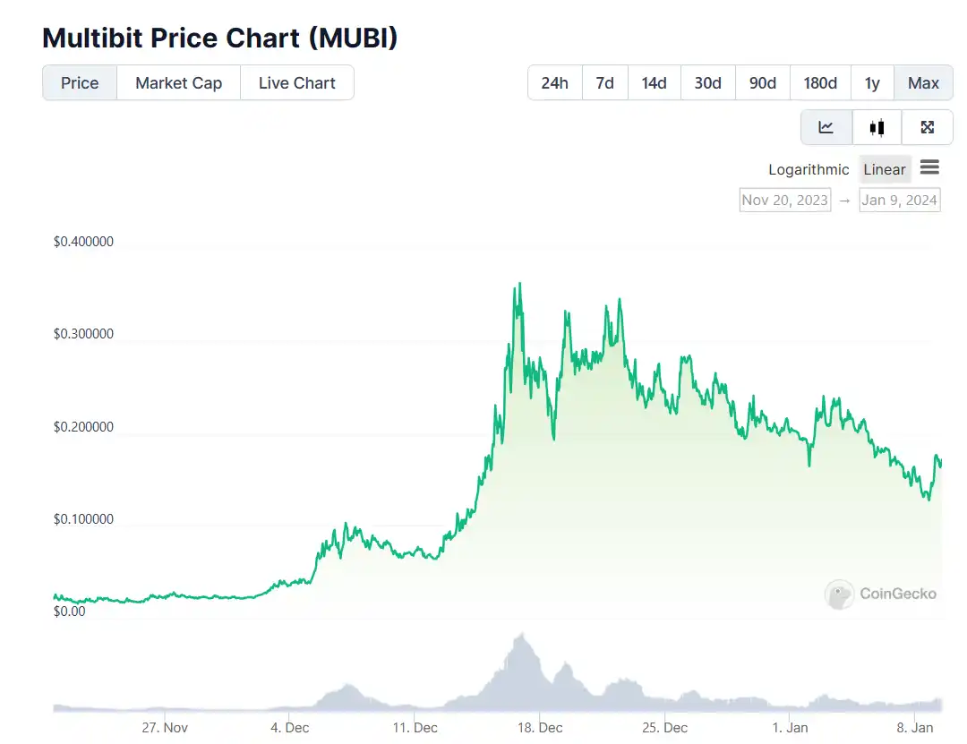 Multibit 是 2023 年 5 月出现的将 BRC20 资产连接至 EVM 网络的桥接协议,允许用户在 ETH 链、BNB 链和 BTC 网络之间无缝转移代币。Multibit 在 11 月 12 日于拍卖平台 Bounce Finance 上完成了 IDO 拍卖,募资 88 枚 ETH。11 月 4 日再次于比特币网络捐赠平台 TurtSat 以相同单价完成 IDO,募资 4.64 枚 BTC。两次总计募资约合 35 万美元。