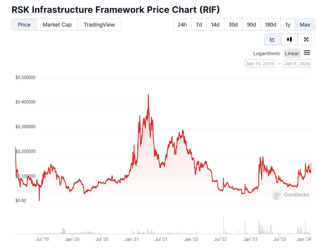 截至目前,RIF 的流通供应量是 10 亿枚,最大供应量尚不明确。RIF 的设计旨在桥接复杂的区块链技术和无缝的用户体验之间的差距,帮助组织创造创新的 DeFi 产品,为解决关键的用户可访问性挑战提供基础设施和资源。