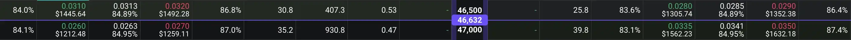 以 1 月 12 日行权的 BTC 为例(当前价格 46632),用 BTC-46500-CALL 和 BTC-47000-PUT 构建组合,需付出约 3000 美元的权利金成本,BTC 需波动至 49932 美元或 43362 美元才可开始盈利。