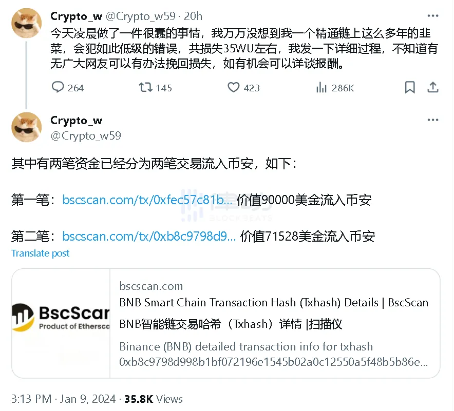 不少社区网友反应在点击了这些官方发布的钓鱼连接后,钱包瞬间被清空。其中,@Crypto_w59 就表示自己在此类事件中损失近 35 万美元。