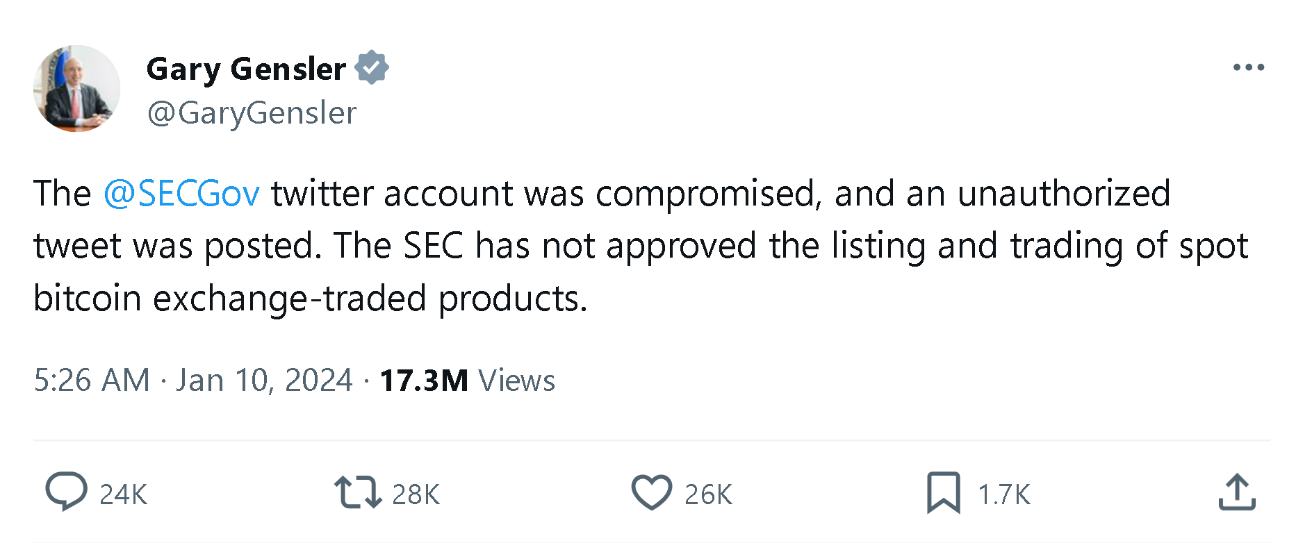 1 月 10 日,美国 SEC 官方在社交媒体发布消息称比特币现货 ETF 被批准。这条推文流量瞬间百万。情绪积攒到这个时候,配上这条加密货币行业等了数年的新闻,没有任何人会觉得这几行字会有任何问题。