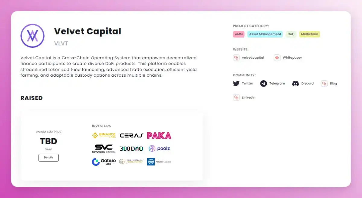 Velvet Capital 是一个跨链操作系统,赋能去中心化金融参与者创造多样化的 DeFi 产品。Velvet Capital 的 TVL 已达 120 万美元。