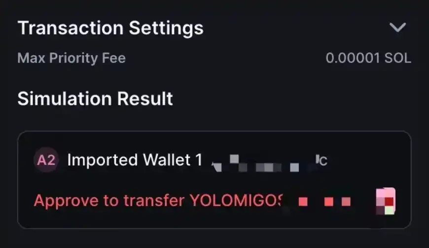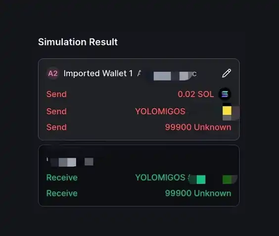 在钓鱼诈骗中,骗子可能会滥用 Durable Nonce 机制,诱导用户签署看似正常但实际上包含恶意操作的交易。由于使用了 Durable Nonce,这些交易不会因为区块哈希过期而失效,给骗子更长的时间窗口来执行交易。例如,骗子可能会设计一个伪装成合法操作的交易,如参与空投或活动,但实际上交易中包含了将用户资产转移给骗子的指令。用户在不知情的情况下签署了这样的交易,但用户会发现在区块上根本没有该交易的发生,因为攻击者只是拿到了该交易的签名,交易本身并没有被发送到区块链上,他们可以在之后的时间里随时将交易广播上链。但是,无论交易是否发生,我们发现这种类型的签名并不会影响交易模拟的结果判断,几个主流钱包依旧能够将交易本身进行模拟和解析并且告知结果,因此我们之前对于交易模拟结果的判断还是有效的方法论。