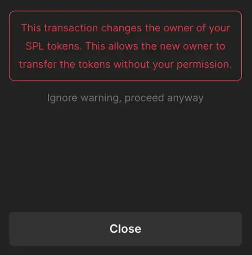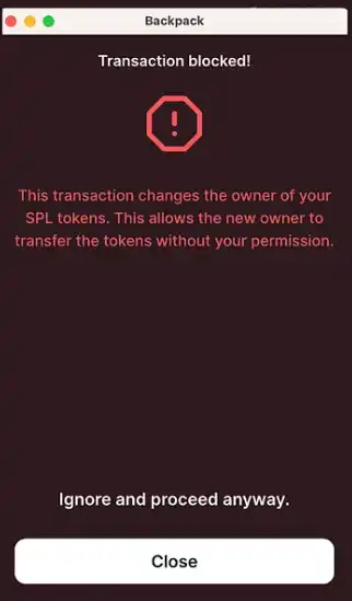 除了直接代币外,GoPlus 还发现了部分的钓鱼网站采用了 createSetAuthorityInstruction 的操作将 instruction 打包进交易中,该操作的本质是将账户上代币的所有权进行转移,Solana 的账户模型和 EVM 有所不同,每一个账户地址对于每一个代币,都会有一个专门的 Token Account 对应,Token Account 会有一个 owner,该 owner 就是当前的账户,Token Account 同时记录了对应 Token 的余额和相关信息。而 createSetAuthorityInstruction 操作可以直接将当前代币的所有权转给另外一个账户,实际最终的效果等同于将当前的代币全部转给了该账户。我们分别在 Phantom 和 Backpack 上进行了该操作实验,庆幸的是,这两个钱包都进行了特别的提醒和警告。