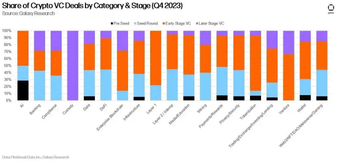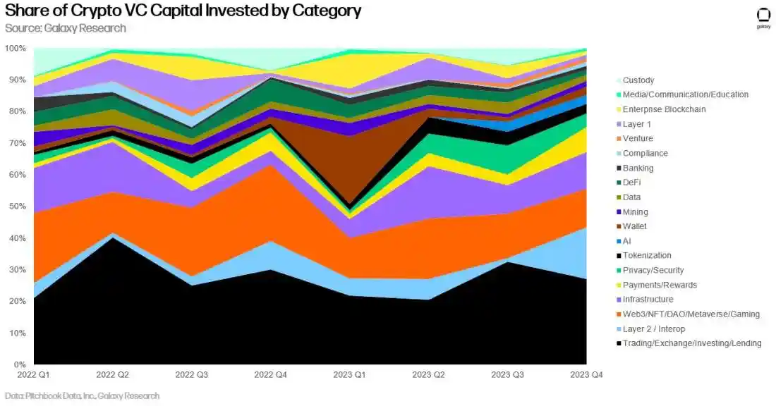 ·交易和 Web3 公司继续占据主导地位,但人工智能正在呈现增长。为投资者提供买卖加密货币方式的公司继续在融资中占据主导地位,但第 2 层和互操作性投资在第四季度有所增加,虫洞桥筹集了大量资金。人工智能正在成为一个更有趣的类别,有几家初创公司进入了这个领域。