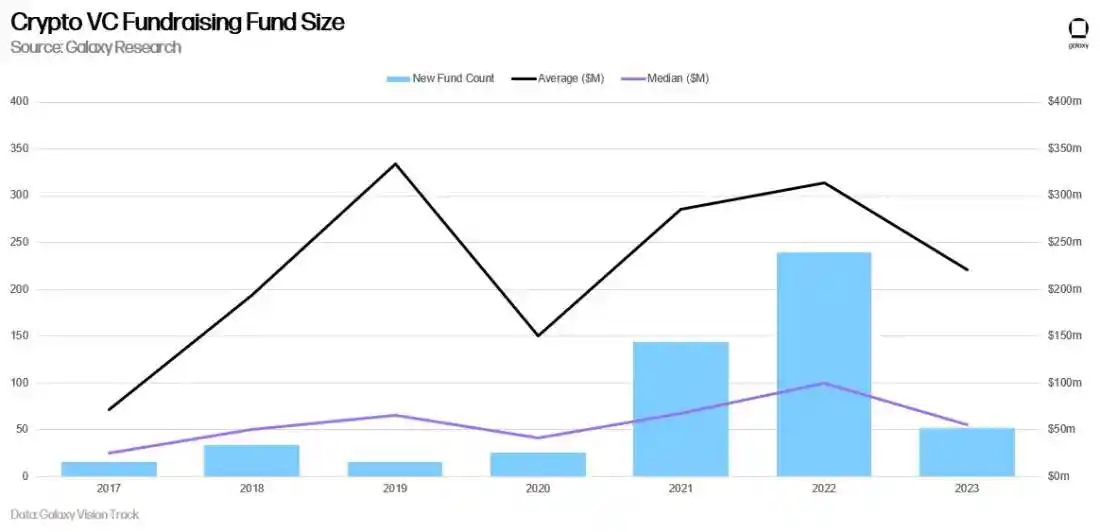 从年度来看,2023 年是自 2020 年以来新推出的加密货币风险投资基金数量最少的一年。平均基金规模同比下降 30%,而基金规模中位数下降 45%。