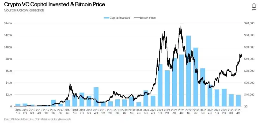 虽然风险投资通常与比特币价格相关,但这种相关性在 2023 年显着打破,比特币上涨 160%,而加密货币风险投资资本投资不断创下新低。