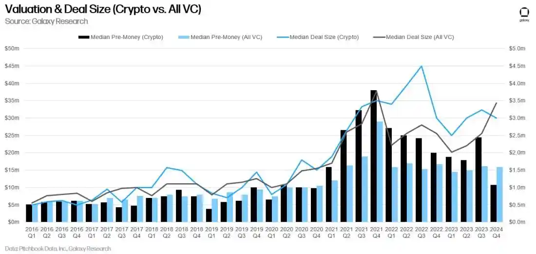 风险投资支持的加密货币公司估值在 2023 年大幅下降,第四季度达到 2020 年第四季度以来的最低投前估值中位数,而所有风险投资的投前估值在 2022 年初最初下降后保持相对稳定。第四季度较 2022 年第三季度 450 万美元的历史高点下降了 33%。