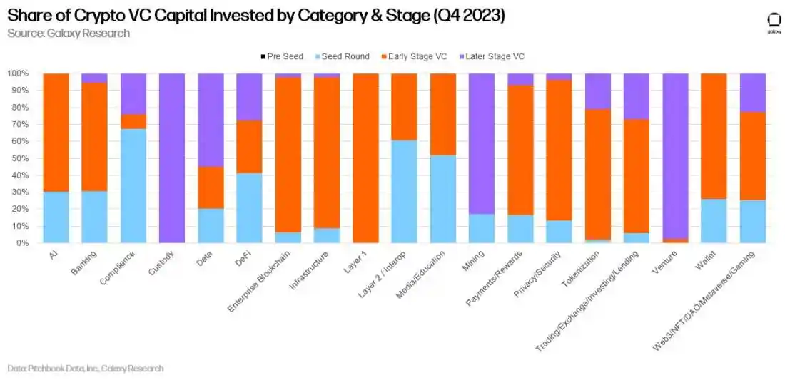 从阶段来看,合规类别中的初创公司偏向种子阶段,而风险投资和托管类别中的资本则严重偏向后期阶段。如果公司是融资或资本部署的平台,则被归类为「风险投资」。请注意,一家公司在托管类别中筹集了后期资金,但没有披露交易规模,因此该图表中的一栏基于极其有限的数据。