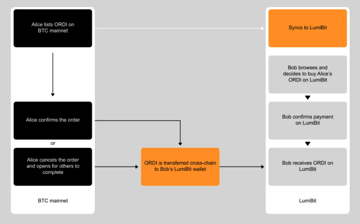 这意味着,用户在 LumiBit ⽹络即可进⾏铭⽂交易,在 LumiBit ⽹络结算完成后 LumiBit ⽹络将⾃动帮用户执⾏跨链操作。