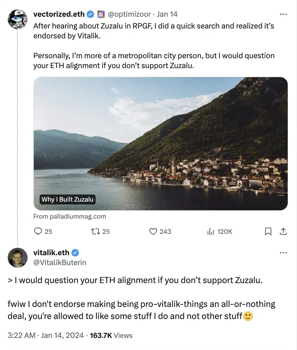 1 月 14 日凌晨,音乐 NFT 平台 Sound.xyz 的协议负责人 vectorized.eth 发布推文称自己在了解什么是 Zuzalu 之后认为「如果你不支持 Zuzalu,我会质疑你的 ETH 一致性。」随后,Vitalik 在评论区也回复了这句话,表示支持 Zuzalu。
