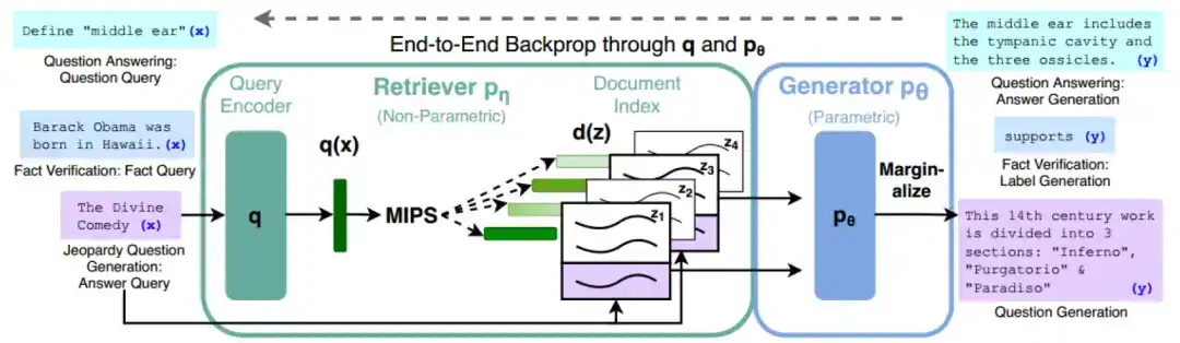 检索系统(Retriever):检索环节包括需求编码器(Query Encoder)和文档索引(Document Index)。使用两个不同的 BERT 模型将需求 q 与文档 z 分别编码为 q(x) 和 d(z),进而使用最大内积搜索算法获取内积最大的文档,将其与需求共同输入生成部分。