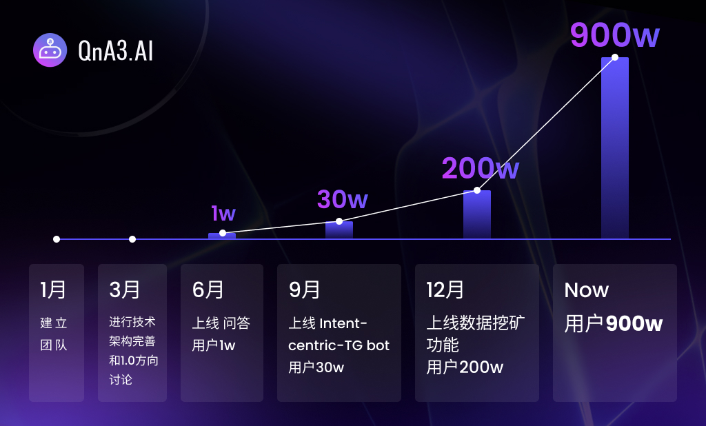 QnA3 团队成立于 2023 年 1 月,在短短一年内实现了其产品从 0 到 1 的巨大蜕变:6 月,QnA3 上线问答功能,用户量突破 1 万;9 月,QnA3 上线以意图为中心的 Telegram 机器人,用户量突破 30 万;12 月,QnA3 上线数据挖矿功能,QnA3 日活跃用户数霸榜 BNB Chain No.1 超过半个月时间,用户量突破 200 万。如今,QnA3 用户数已飙升至 900 万。