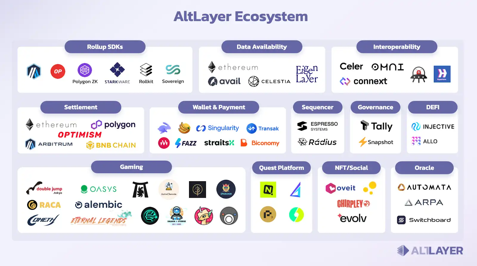 Double Jump Tokyo: Double Jump.tokyo 是一家位于日本的区块链游戏开发工作室。他们为游戏娱乐领域的大型企业提供 Web3 游戏和 NFT 开发服务。他们与世嘉、万代、育碧等知名合作伙伴合作,并拥有三国志大战等游戏 IP。Double Jump 也是日本区块链组织的成员,并得到 Jump、Circle 等公司的支持。AltLayer 与 Double Jump 的独家合作伙伴关系将允许开发者推出基于Oasys——Double Jump Tokyo 的游戏专用 Rollup。