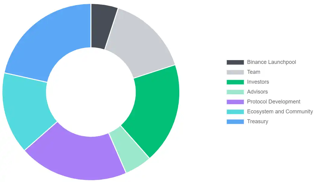 代币分配情况如下图所示。Binance Launchpool 占代币供应总量的 5%,团队、投资者和顾问分别拥有 15%、18.5% 和 5%。20% 用于协议未来发展,15% 分配给生态系统和社区,财库获得 21.5%。