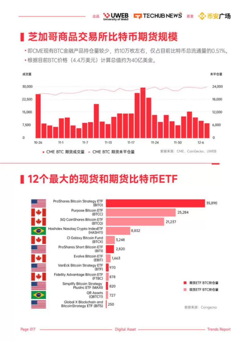 但我们也必须认识到,包括ProShares Bitcoin Strategy ETF(BITO)、Purpose Bitcoin ETF(BTCC)、3iQ CoinShares Bitcoin ETF(BTCQ)在内的现有比特币金融产品持仓量依旧相对较少,总数约10万枚左右,仅占目前比特币总流通量的0.51%,根据目前比特币价格(4.4万美元)计算总值仅为40亿美金。这就代表着其他ETF的市场规模目前并不算大,市场对于这类新型金融工具的接纳需要时间。从以往类似金融产品的市场接受过程来看,虽然基础已经打好,爆发增长仍需时日。因此在2024年,我们期待见证比特币ETF如何逐步推动市场成熟,并带动整个数字资产行业迈向新的里程碑.