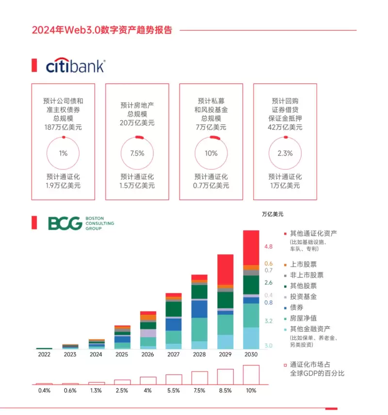 根据波士顿咨询集团的研究,全球现实世界资产通证化规模有望在2030年增长至16.1万亿美元(预计占2030年全球GDP的10%左右),包括3.2万亿的房地产通证,3.9万亿美元的股权通证、1.2万亿美元的债权和投资基金通证、3万亿美元的另类金融资产通证,以及4.8万亿美元的其他通证化资产。