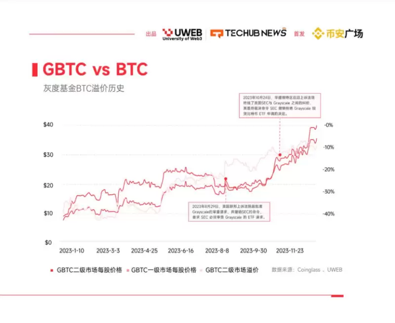 灰度GBTC的溢价率也能看出一些未来趋势。数据显示,从2022年开始,熊市导致GBTC交易价格相对于其持有的比特币价值存在负溢价。灰度母公司数字货币集团旗下Genesis垮台后,GBTC的负溢价现象在2023年年初加剧,创下近50%的历史新高。溢价率的回升,代表着市场对比特币ETF的期待正在增加。此外,10月24日华盛顿特区巡回上诉法院对SEC与Grayscale纠纷的最终裁决,似乎代表了监管机构对比特币ETF的态度正在逐渐软化,一大批比特币现货ETF的通过或许正在路上。