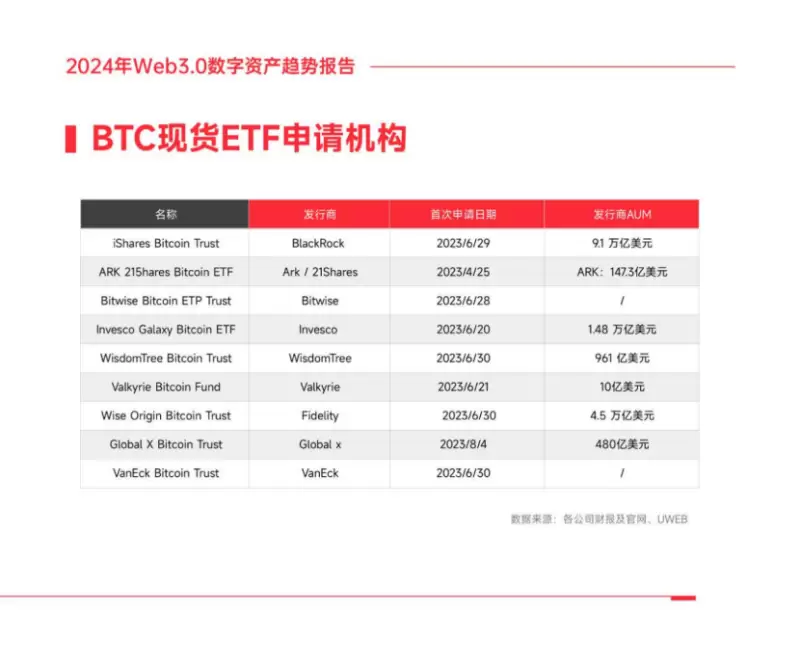 在展望 2024 年行业发展趋势时,我们首先关注的是现货ETF(交易所交易基金)对于数字资产市场的影响,尤其是比特币。美国比特币现货ETF在2024年获批的概率日益增大,这一迹象预示着数字资产市场可能站在一个新的历史起点上。尽管从短期视角来看,比特币现货ETF的通过对市场的刺激效应可能并不明显,许多机构投资者通常会采取更为审慎的投资策略,不会急于在初期进行大规模资金投入,市场反应可能相对温和。