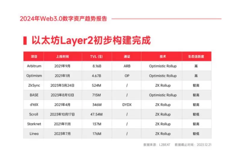 截至2023年12月21日,Layer2赛道的总锁定价值(TVL)达到了161亿美元,Optimistic Rollup和ZK Rollup成为市场的主导技术。其中,Arbitrum以其显著的市场份额和2022年的交易量大幅增长,奠定了其在Layer2赛道中的领导地位。Base、zkSync和Mantle等项目不仅在技术上取得了重大突破,也在市场份额上实现了显著的增长。