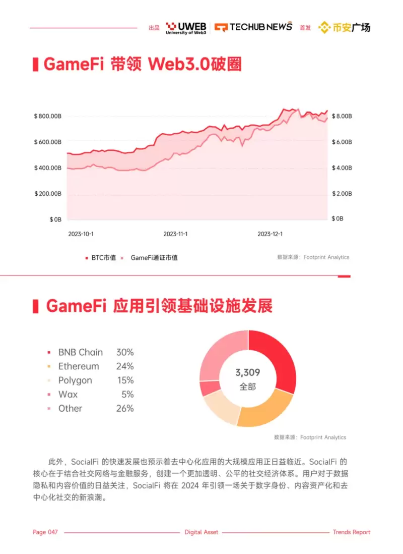 同时,GameFi 的发展也带来了Web3.0 在更广泛领域的“破圈”现象。游戏行业的这一分支,不仅吸引了大量非传统数字资产用户,也展示了区块链技术在娱乐和互动内容上的巨大潜力。通过 GameFi,更多的人将体验到区块链带来的新玩法和价值模式,从而推动整个 Web3.0 生态的普及和成长。截至2023年12月21日,GameFi领域的蓬勃发展已经显著反映在其相关通证的市值上,达到了约75亿美元。这一数据不仅体现了GameFi作为一个新兴领域的强劲增长势头,也预示着其在整个数字资产生态中的日益重要性。在游戏赛道开发上,BNB Chain、Ethereum和Polygon作为行业的佼佼者,继续领跑传统公链。这些公链以其稳定性、高效率和广泛的应用支持,为各类GameFi项目提供了坚实的基础设施。