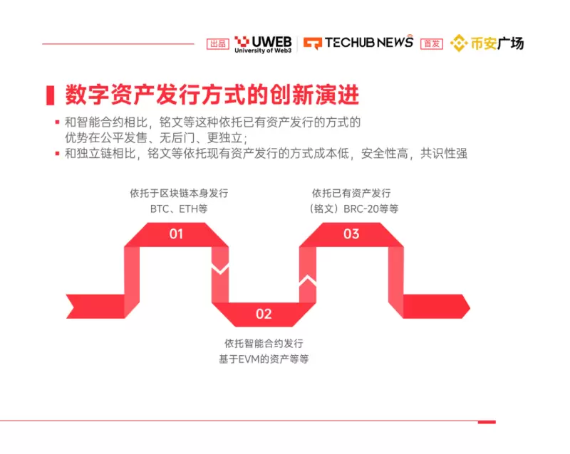 实际上我们认为,在数字资产领域,底层技术的革新往往预示着市场的大幅波动,尤其是牛市的来临。在最近的市场发展中,铭文的创新可谓是对数字资产发行方式的一次重大创新升级。数字资产发行方式的创新从最初的区块链原生资产发行(如 BTC、ETH),到依托智能合约技术的资产(基于 EVM 的资产),再到铭文这样的资产发行方式,我们见证了一个不断演进的发展轨迹。