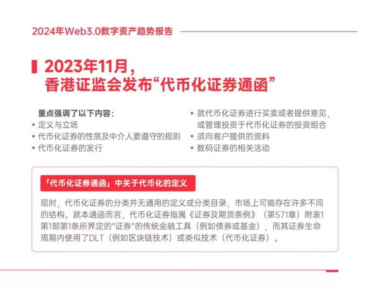 目前越来越多的机构,包括传统金融机构如中国太平洋保险集团旗下中国太保投资管理(香港)都已获得香港证监会批准升级现有第一类(证券交易)和第四类(就证券提供意见)受规管业务牌照,升级后可向虚拟资产投资比例超过 10% 的基金提供分销和投资顾问服务。这预示着传统公司将在未来大规模介入数字资产领域。2024年,我们可以预见香港的金融体系将与Web3.0技术进一步融合,为全球数字经济和区块链技术的发展开辟新的可能性。