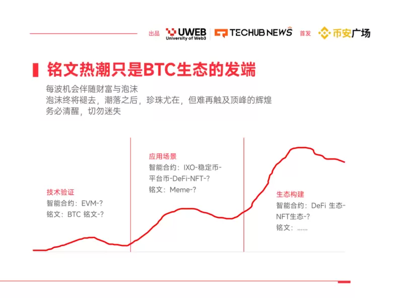 总的来说,铭文热潮只是新生态的发端,是数字资产生态中底层创新的第一波浪潮。历史上的每次底层技术革新,往往伴随着三个阶段的发展:技术验证、泡沫形成,最后是市场回归理性。每一波都伴随着巨大的机遇和风险,吸引着资本和创新者的热切关注。在这个过程中,初期的泡沫可能会带来快速的财富增长,但这往往是短暂和不稳定的。随着市场逐渐饱和和理性回归,这些泡沫最终会退去。