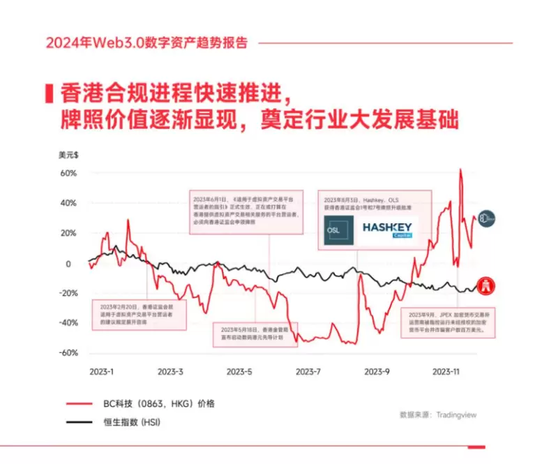 香港在合规进程的快速推进上也取得了显著成果,牌照价值逐渐显现,为行业的大发展奠定了基础。从OLS(原BC科技)的股价与恒生指数(HSI)的走势对比,我们可以观察到OLS的股价在下半年明显跑赢了大盘。尤其是在8月3日,Hashkey和OLS宣布获得香港证监会1号和7号牌照升级批准后,使得OLS股价在短期内出现剧烈波动,其后股价的上涨则可能表明市场对这一战略投资的积极反应,认为它将为公司带来正面的长期影响。这种表现很可能反映了主流机构投资者对Web3.0领域的增长潜力和长期价值的认可。同时反映出了Web3.0作为一个行业,正在逐渐获得主流投资市场的广泛关注和信任。投资者和分析师们都在密切关注这一新兴领域,以把握其带来的投资机会。
